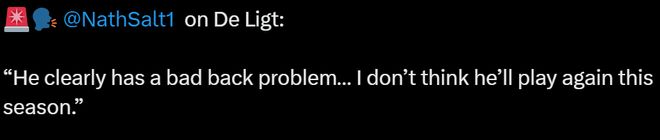 前主教練魯本·阿莫林最初聲稱,德裏赫特隻需要缺席一周。「對馬泰斯(德裏赫特)而言,這隻是小傷。」阿莫林在曼聯對西漢姆聯的賽前發布會說,「我預計馬泰斯下一場比賽(做客狼隊)就能出場。」
